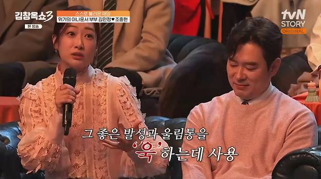 2025년 3월 방송된 tvN STORY ‘김창옥쇼3’에서 김민정은 남편의 말투 때문에 겪는 고충을 털어놓았다. 김민정은 대중들에게 보여지는 남편의 이미지는 서글서글하고 유쾌하지만, 집에서는 매우 욱하는 성격이라고 설명했다. 아나운서임에도 불구하고 소통보다는 그 좋은 발성을 욱하는 데 사용한다고 토로했다.