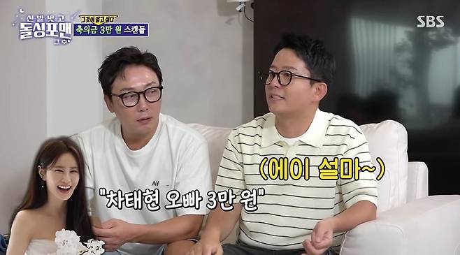 김준호는 “축의금을 확인하면서 지민이가 불러줬다. ‘차태현 3만원’이라고 해서 ‘봉투 봐. 3만원?’이라며 당황했다”고 당시 상황을 생생하게 전했다.